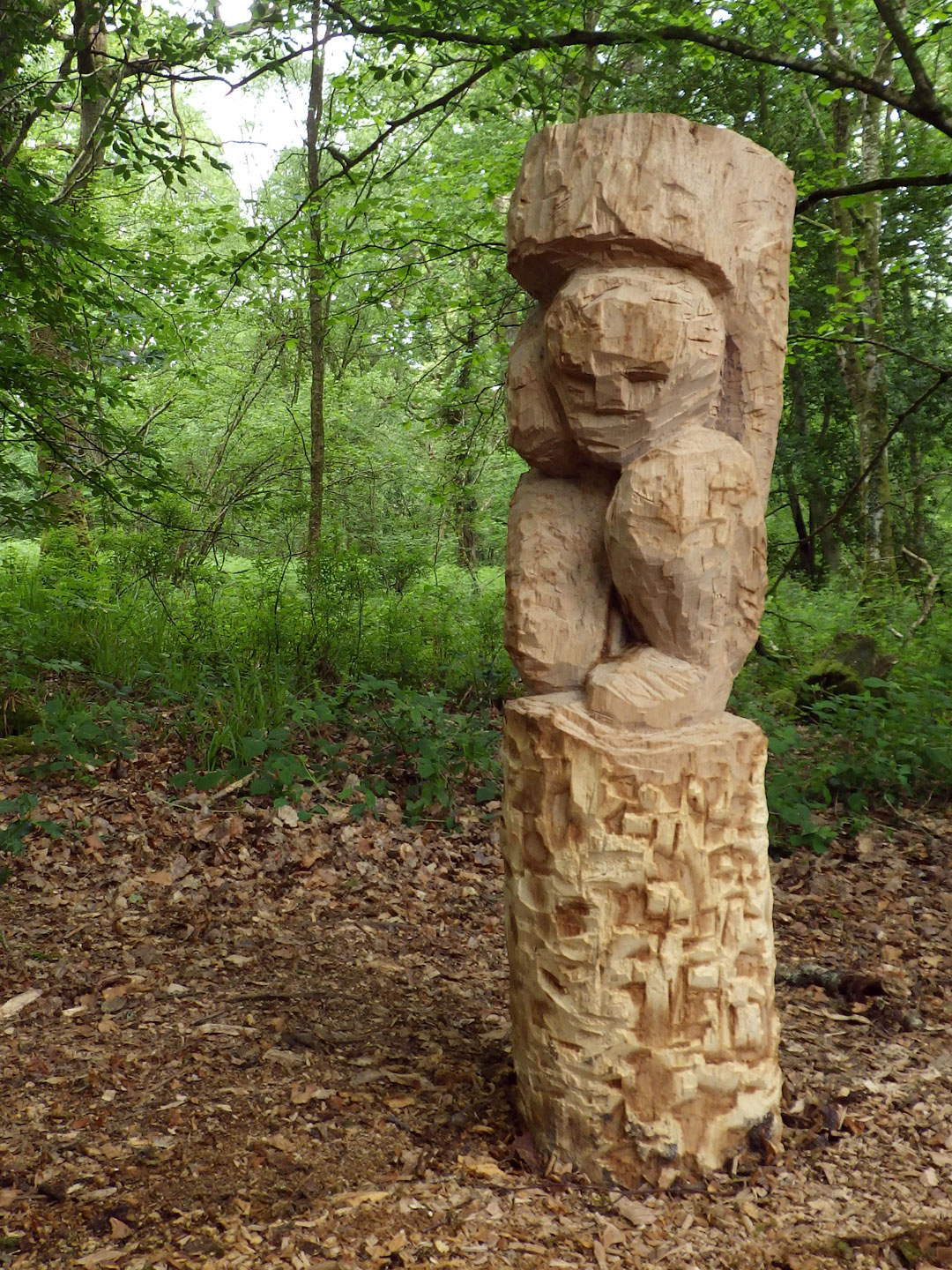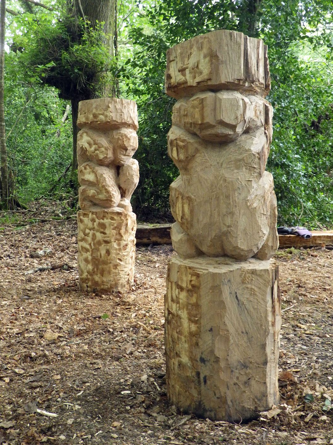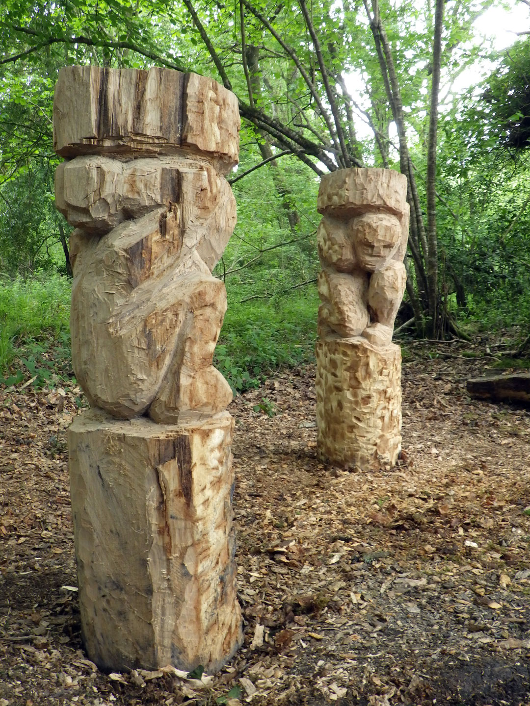 For the Tomnafinnoge Sculpture symposium I wanted to carve figures that would seem to be "of the woods". The resulting diptych sculpture "Gateway" was carved and set as an entrance portal to a shaded glade. The two figures are blocky, roughly chiseled caryatids in short oak columns. Male and female, these represent a duality within nature that is both benign and malign in its disinterest. Rather than classical Greek caryatids these are reminiscent of the late bronze age "Ralaghan Man", an anthropomorphic, carved wooden figure found in the bog of Ralaghan Co Cavan.