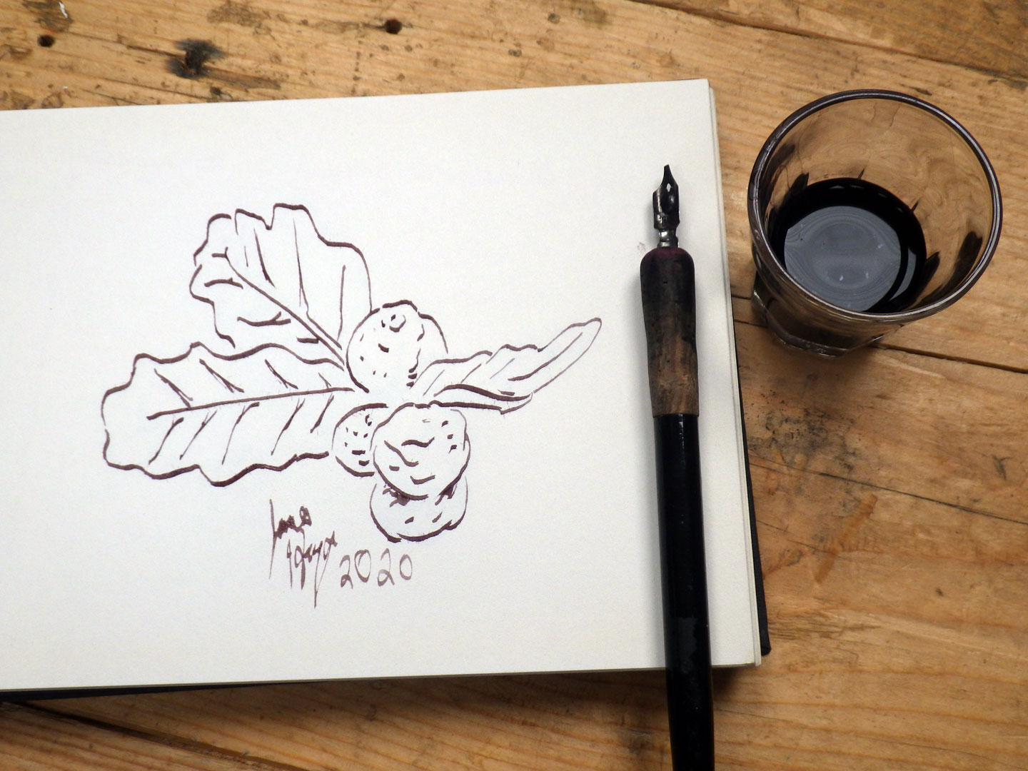For the Aos Dara / Umha Aois combined symposium 2020 I investigated making ink from oak galls and oak sawdust. At the same time I also created a wood block print using oak wood harvested during the previous year's symposium. The ink making experiment involved searching for and collecting oak galls, and then carrying out and documenting the experiments in my own studio.
