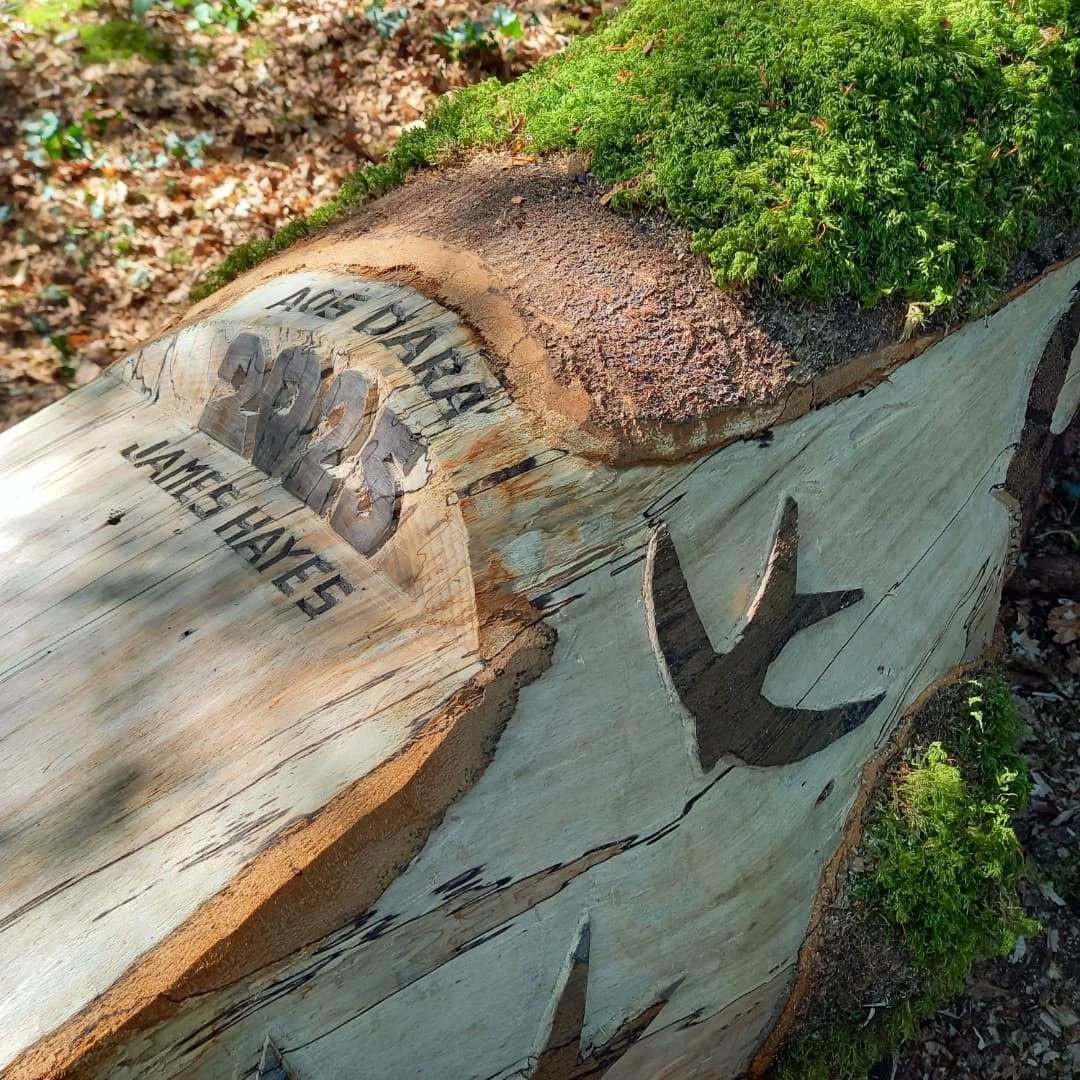 I arrived at the symposium with an idea for a carved bench and set out into the woods to find an appropriate fallen tree. I was very lucky to find this perfect specimen of a huge Beech tree branch. Over the course of the 10 days I laid out a design of swallows swooping up and down in flight over a hilly landscape. Large knots in the tree created natural points for the design to flow over and under. I removed wood along the top down to a suitable bench height, and used a hand plane to create a silky smooth finish. I finished by carving out the year, the name of the symposium (Aos Dara) and my own name. I used oak gall ink, which I made during the 2020 symposium, to enhance the contrast between the text and the background wood.
