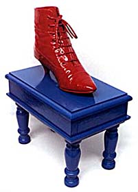 "THERE WAS AN OLD WOMAN WHO LIVED IN A SHOE", Installation, 2m x 2m x 40 cm, Shoe, footstool, enamel paint, stencilled lettering