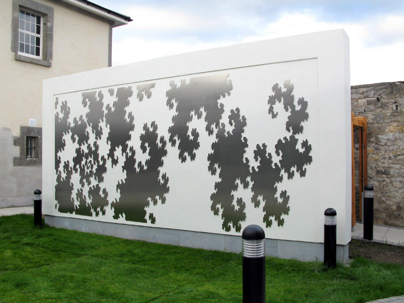 Stradbally Library & Arthouse Studios, Co Laois. Laser cut 3mm stainless steel float mounted 0.5cm on courtyard wall. 6m x 2.7m (approx 19.7' x 8.9')