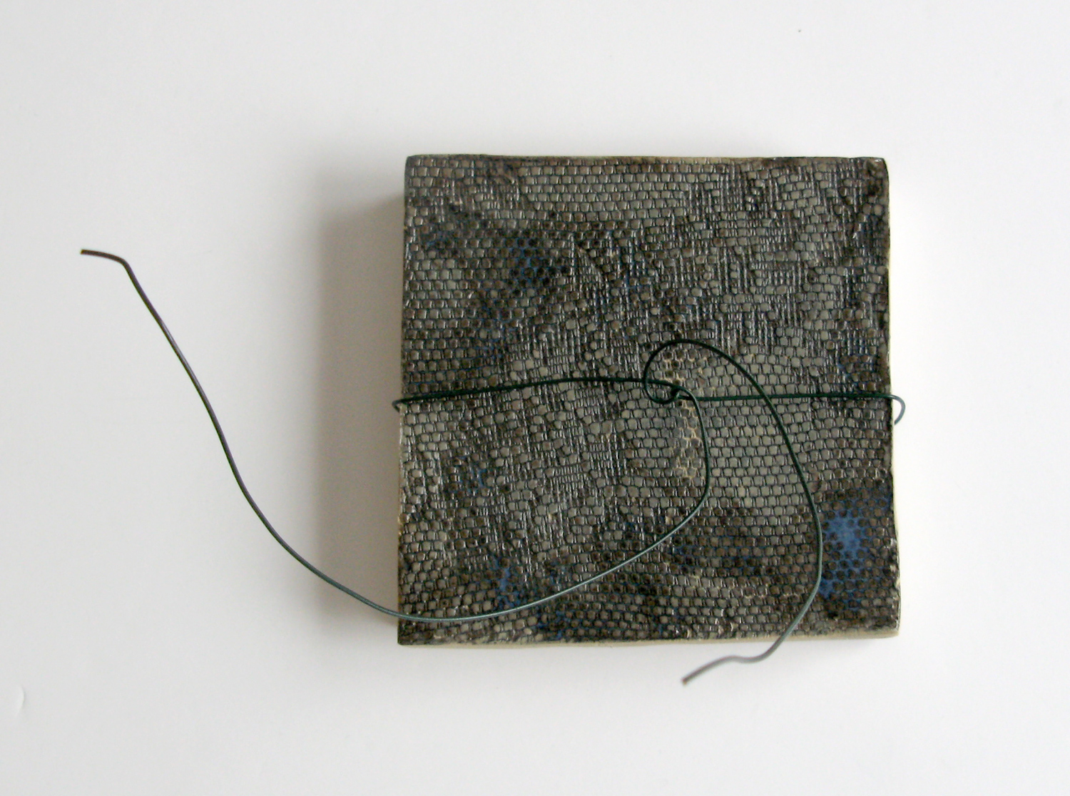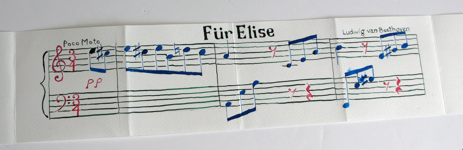 This is an "accordion" book, such that the full image can be seen if/when the book is fully open. The unique book was made as a gift and contains an ink drawing of the opening bars of Für Elise by Ludwig van Beethoven. A floral doily was pressed into the clay while wet to create a pattern on the covers. Garden wire was used to bind the book.