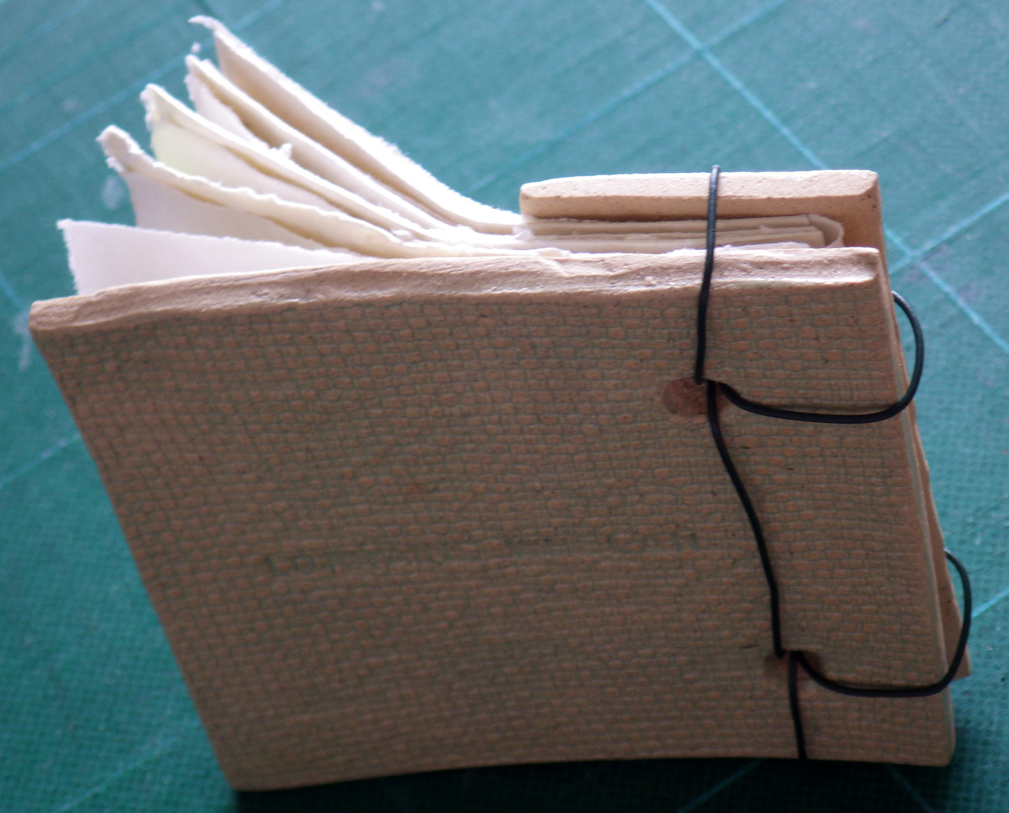 This is a unique book, made as a gift, using a simple stab-binding technique. Each page contains a drawing, rubbing, or watercolour of a house key, using a variety of materials. A floral doily was pressed into the clay while wet to create a pattern on the covers. Garden wire was used to bind the book.