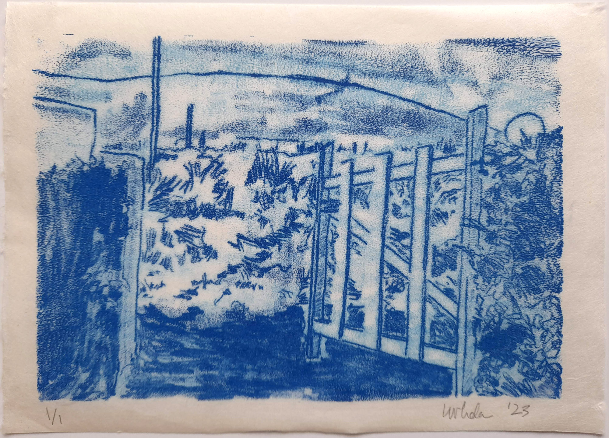 - The gate in front of the house led to a huge field, 2023, monoprint, ink on Japanese mulberry paper, 2.5 cm x 18.5 cm