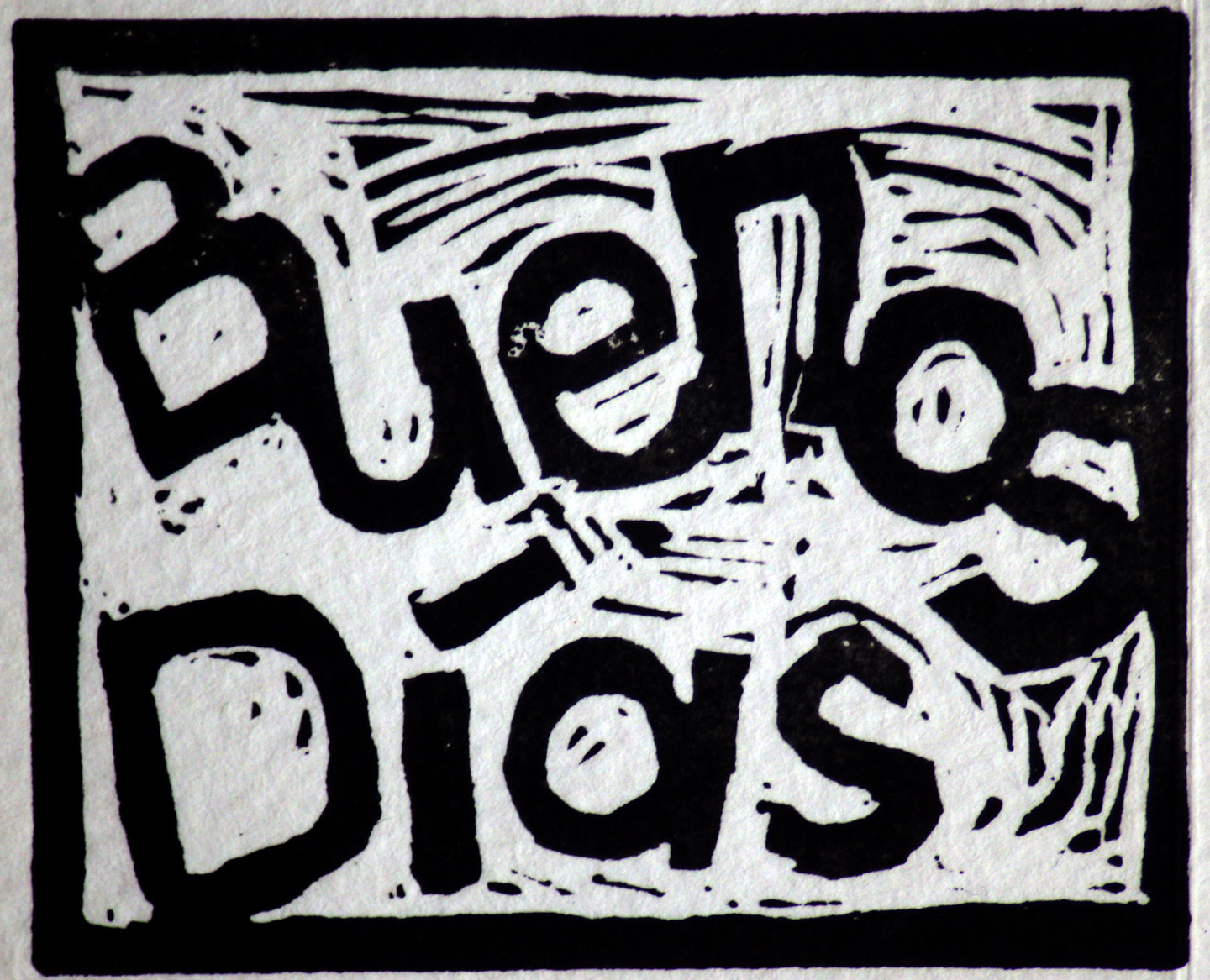 - Buenos Días, lino print, ink on Strathmore paper, image size 6 cm x 7.5 cm