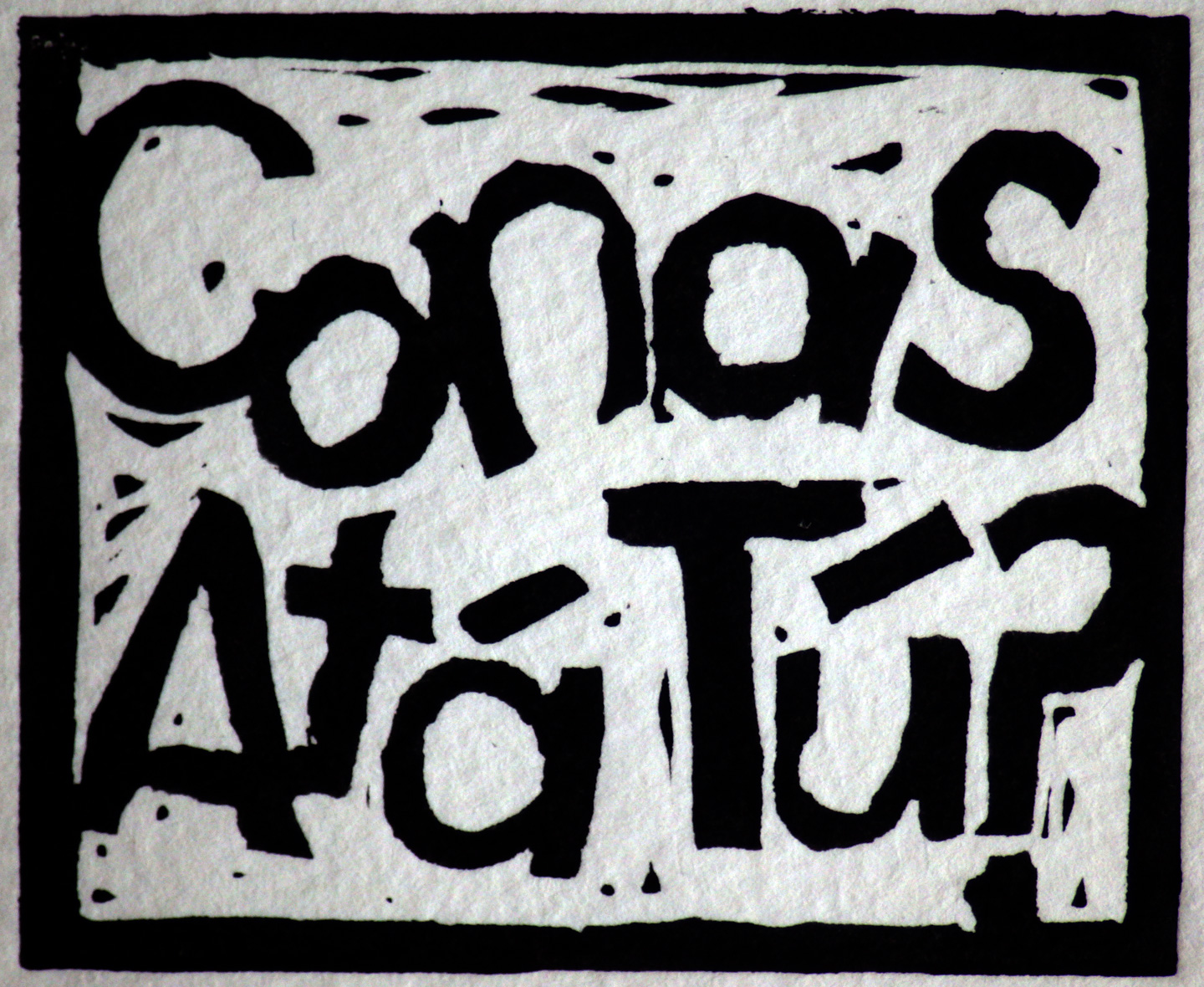- Conás Atá Tú, lino print, ink on Strathmore paper, image size 6 cm x 7.5 cm
