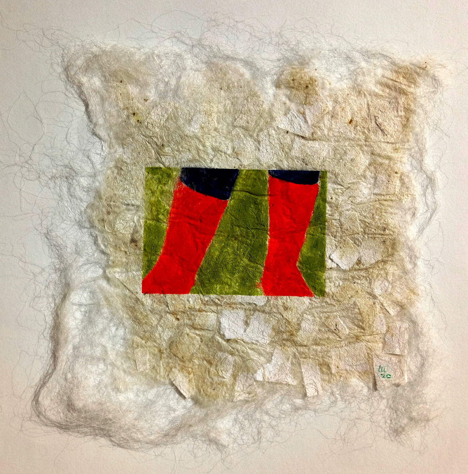 - Red Wellies, 2020, monoprint on handmade silk fibre sheet, image size: 9 cm x 13 cm, sheet size: approx 24 cm x 24 cm