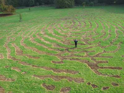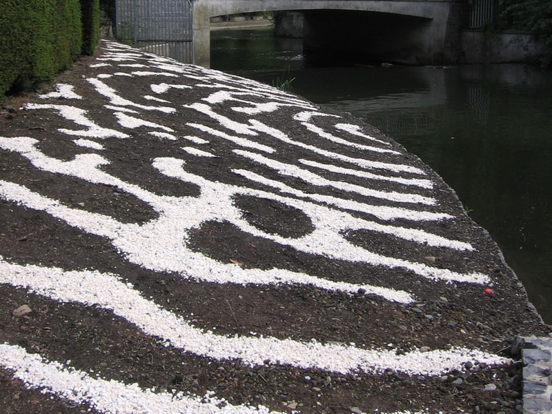 I have also had several opportunities to create truly large scale work. At the "Emo Court Artsts Symposium 2005" I created an image of my fingerprint measuring 120 metres by 80 meters by burning the image into a harvested field. At the 2006 "Sculpture in Context" exhibiton at the National Botanic Gardens Dublin, I created another large scale image of my fingerprint. I used decorative white gravel on dark soil, along a riverbank measuring 35 meters by 5 meters.