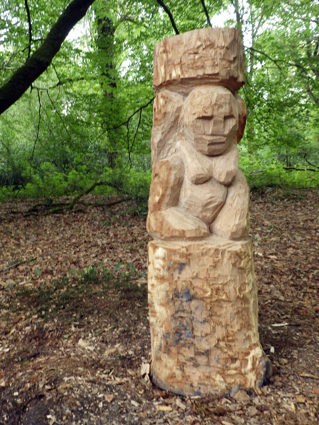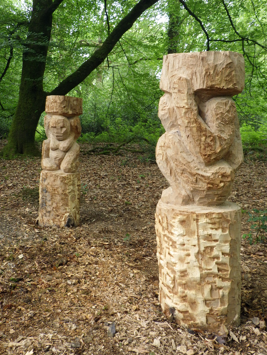 For the Tomnafinnoge Sculpture symposium I wanted to carve figures that would seem to be "of the woods". The resulting diptych sculpture "Gateway" was carved and set as an entrance portal to a shaded glade. The two figures are blocky, roughly chiseled caryatids in short oak columns. Male and female, these represent a duality within nature that is both benign and malign in its disinterest. Rather than classical Greek caryatids these are reminiscent of the late bronze age "Ralaghan Man", an anthropomorphic, carved wooden figure found in the bog of Ralaghan Co Cavan.