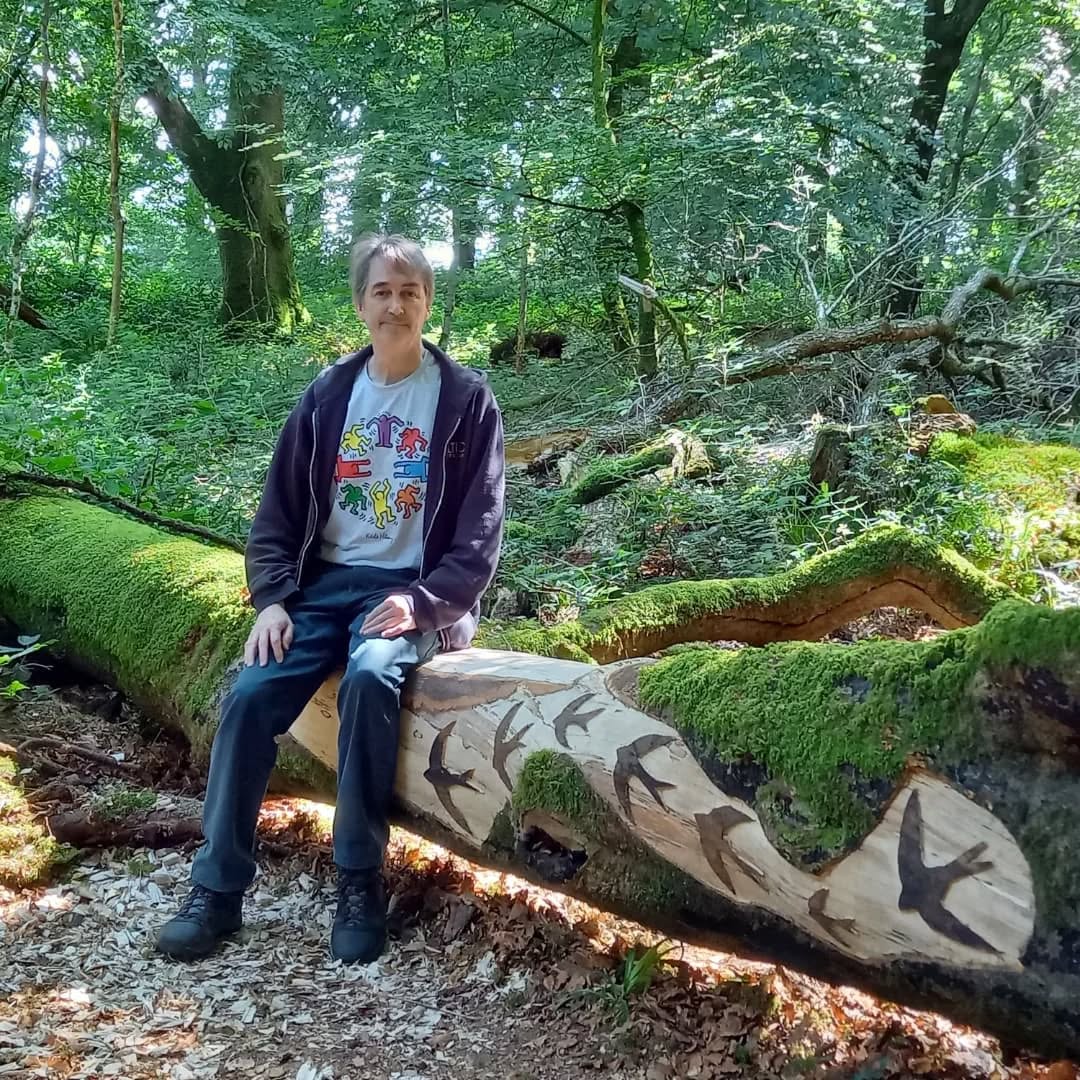I arrived at the symposium with an idea for a carved bench and set out into the woods to find an appropriate fallen tree. I was very lucky to find this perfect specimen of a huge Beech tree branch. Over the course of the 10 days I laid out a design of swallows swooping up and down in flight over a hilly landscape. Large knots in the tree created natural points for the design to flow over and under. I removed wood along the top down to a suitable bench height, and used a hand plane to create a silky smooth finish. I finished by carving out the year, the name of the symposium (Aos Dara) and my own name. I used oak gall ink, which I made during the 2020 symposium, to enhance the contrast between the text and the background wood.