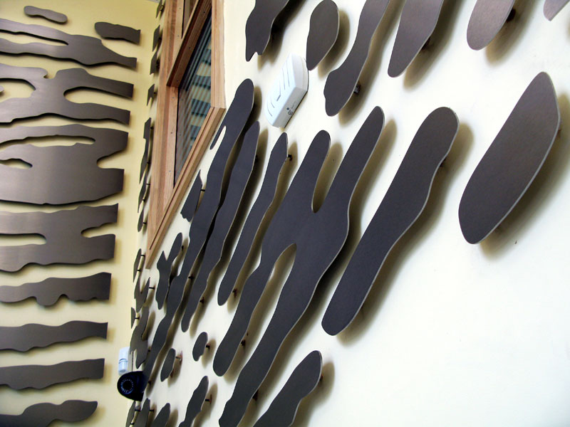 The sculpture consists of an anamorphic (distorted) fingerprint, stretching across the reception area walls. This image appears as a distorted pattern from most angles, but resolves itself when viewed from the opposite corner of the reception area.