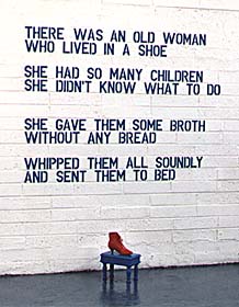 My piece entitled "THERE WAS AN OLD WOMAN WHO LIVED IN A SHOE" re-presents this traditional nursery rhyme. The artwork combines the text of the rhyme with the physical reality of a woman's shoe. This is not a cartoon, 3-storey hobnailed boot replete with roof, door & windows! The sad reality of this nursery rhyme is that the woman's home is the shoe on her foot, which reveals much about her situation.
