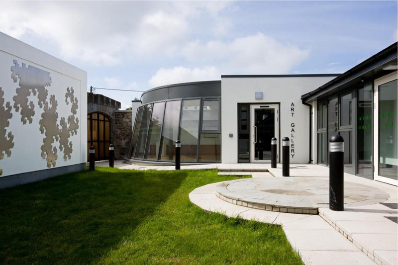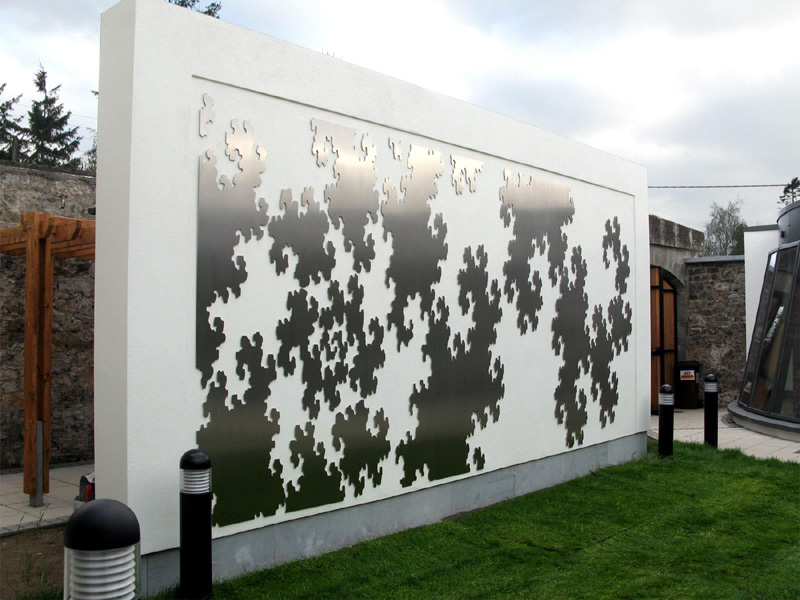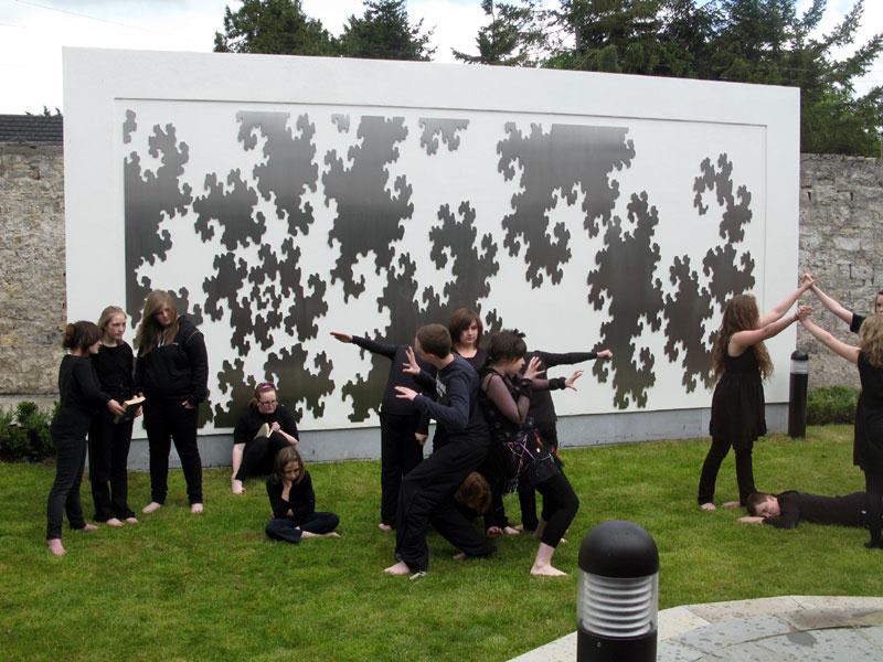 Stradbally Library & Arthouse Studios, Co Laois. Laser cut 3mm stainless steel float mounted 0.5cm on courtyard wall. 6m x 2.7m (approx 19.7' x 8.9')