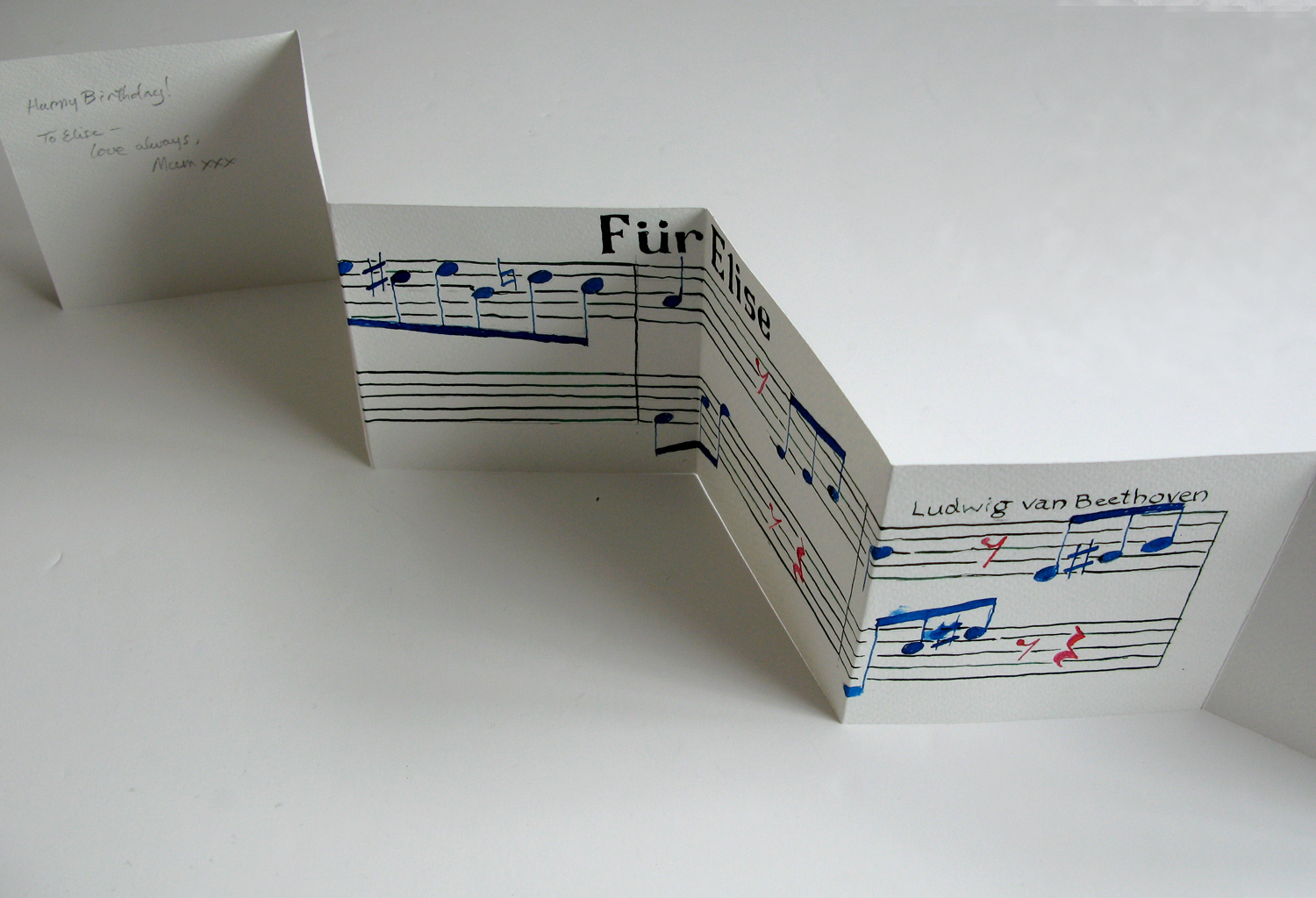This is an "accordion" book, such that the full image can be seen if/when the book is fully open. The unique book was made as a gift and contains an ink drawing of the opening bars of Für Elise by Ludwig van Beethoven. A floral doily was pressed into the clay while wet to create a pattern on the covers. Garden wire was used to bind the book.