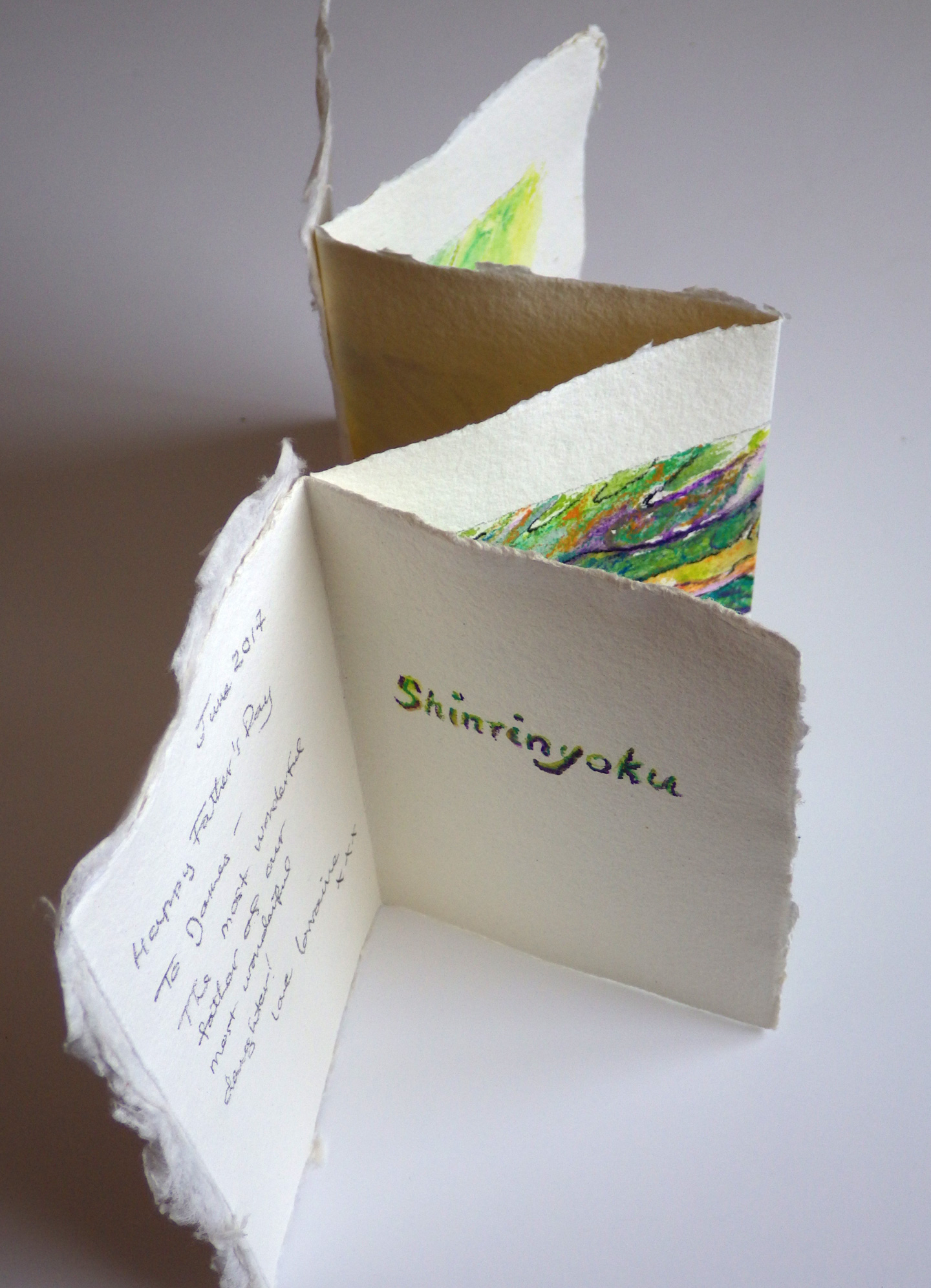 This is a variant of an "accordion" book, such that the full image can be seen if/when the book is fully open. It is a variant in that the covers are attached differently to allow for a title and end page, so they remain hidden when the "accordion" image is unfolded. The unique book was made as a gift and contains a drawing of fallen trees in the forest. PVA glue was used to attach the covers to the accordion drawing.