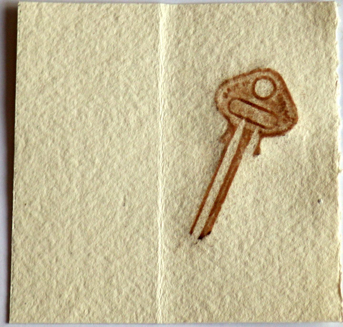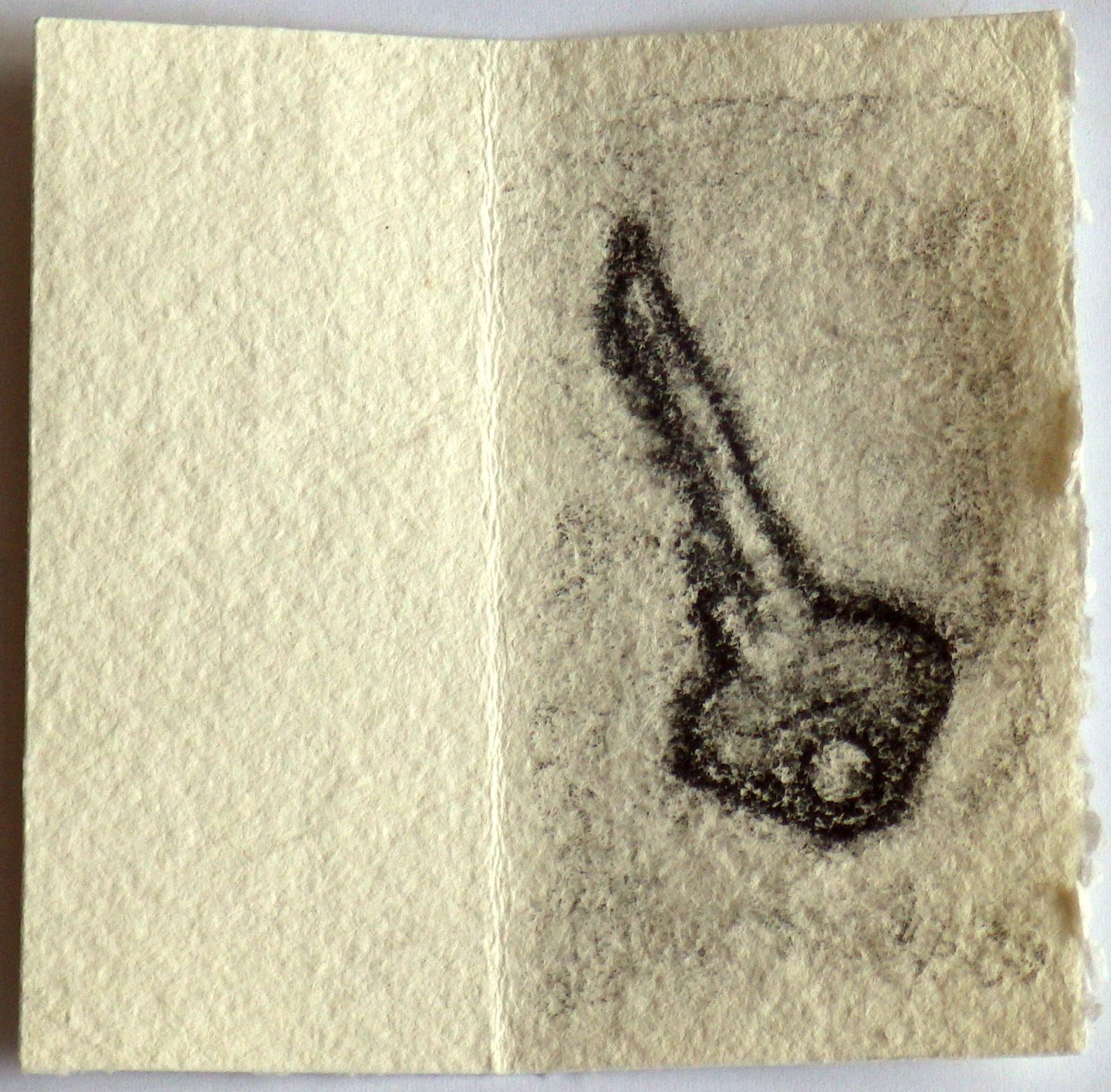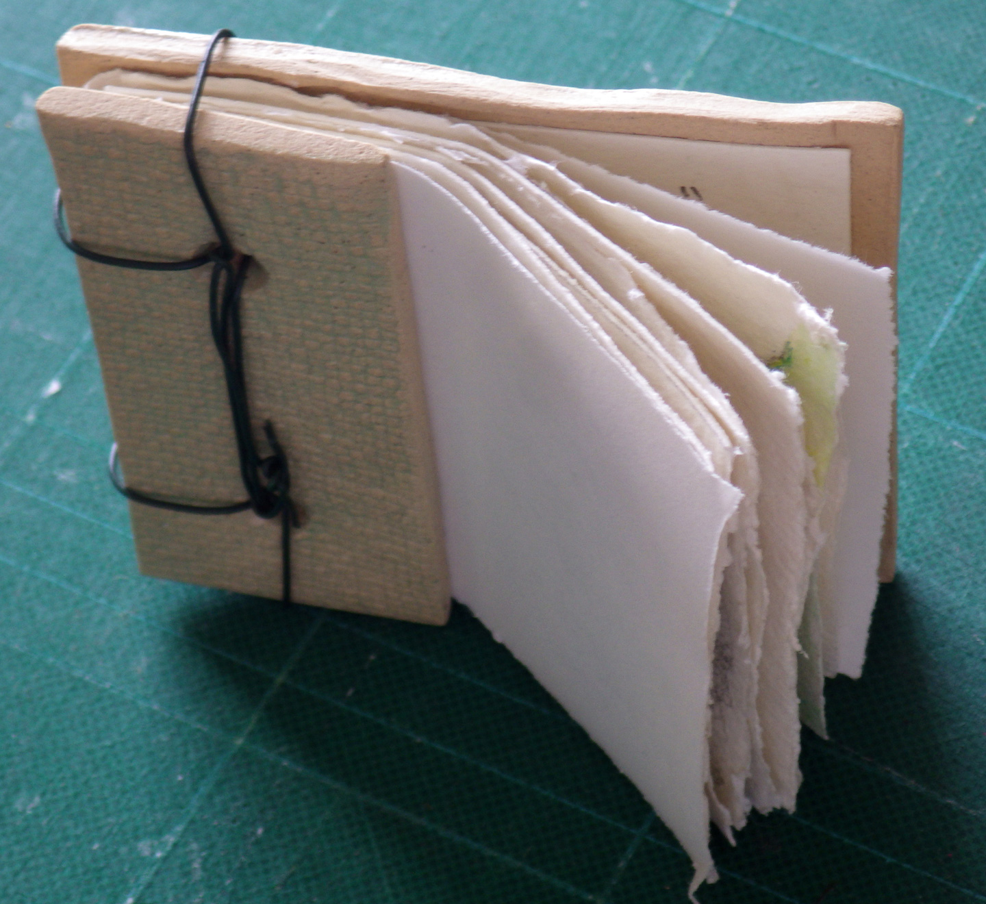 This is a unique book, made as a gift, using a simple stab-binding technique. Each page contains a drawing, rubbing, or watercolour of a house key, using a variety of materials. A floral doily was pressed into the clay while wet to create a pattern on the covers. Garden wire was used to bind the book.