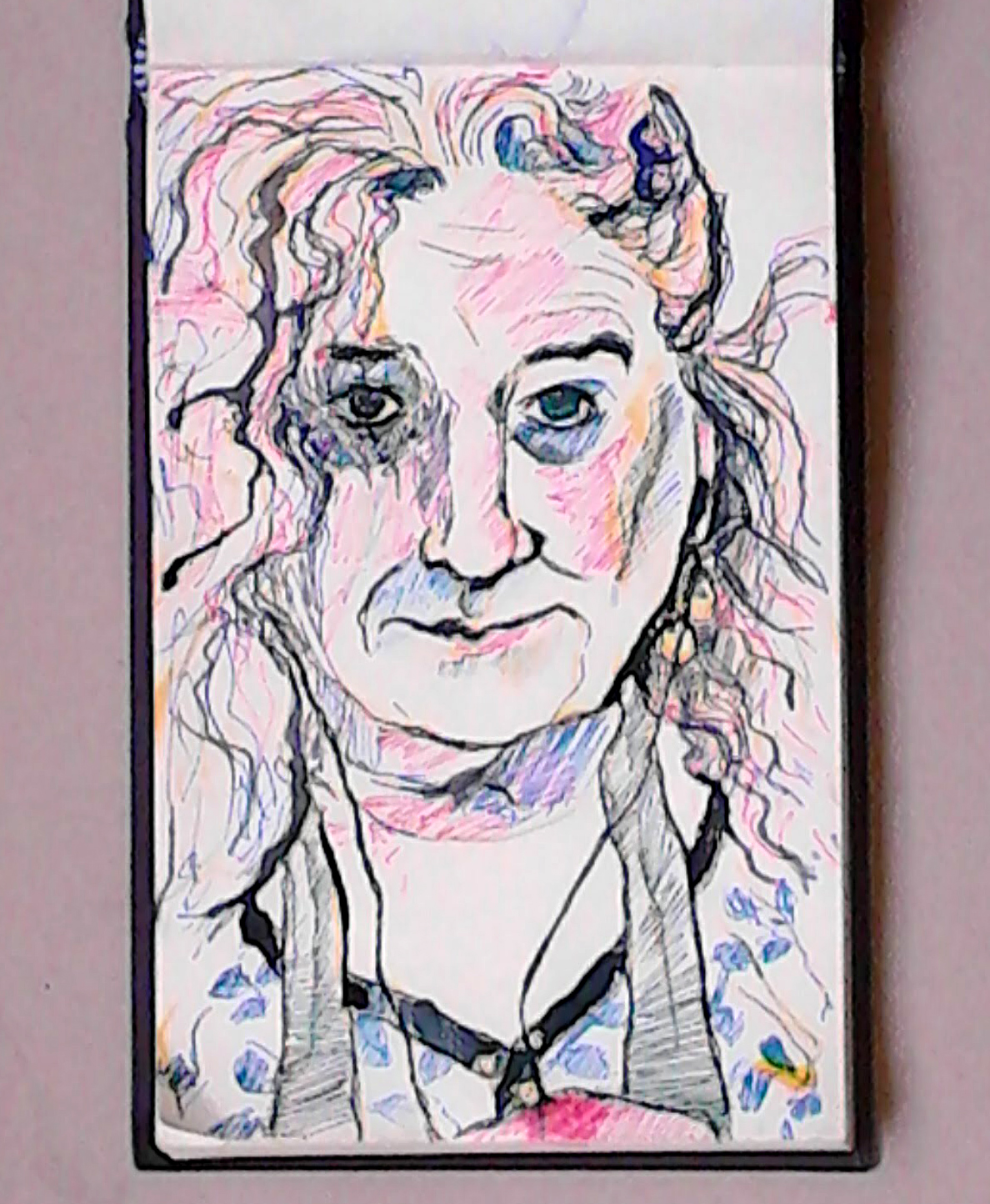 - self-portrait: As I had done in my 2018 residency, I decided that a great daily warm-up was to draw a self-portait in a dedicated A5 sketchbook. There was a full length mirror at which I sat in front, and I had a variety of media to use on the table next to me. Each day was different, depending on my mood!