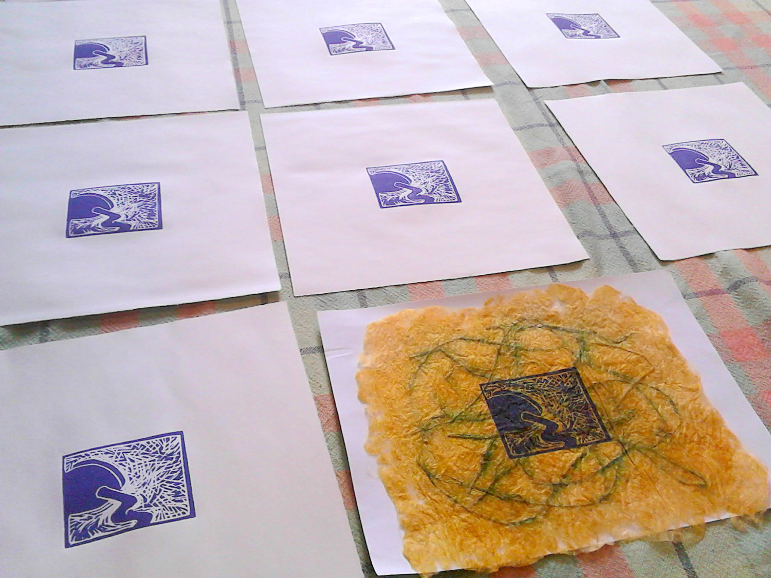 - Distance, 2020, lino print, edition & unique silk fibre sheet prints drying