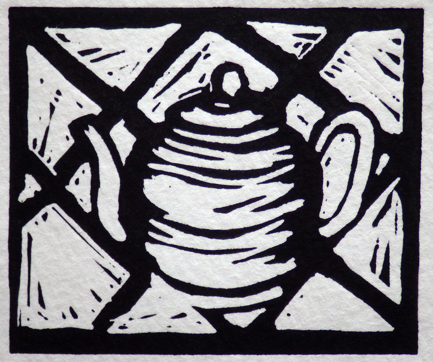 - Teapot, lino print, ink on Strathmore paper, image size 6 cm x 7.5 cm