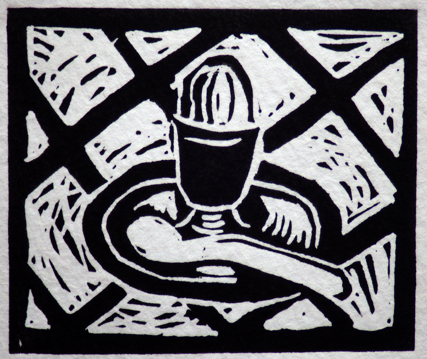 - Good Morning, lino print, ink on Strathmore paper, image size 6 cm x 7.5 cm