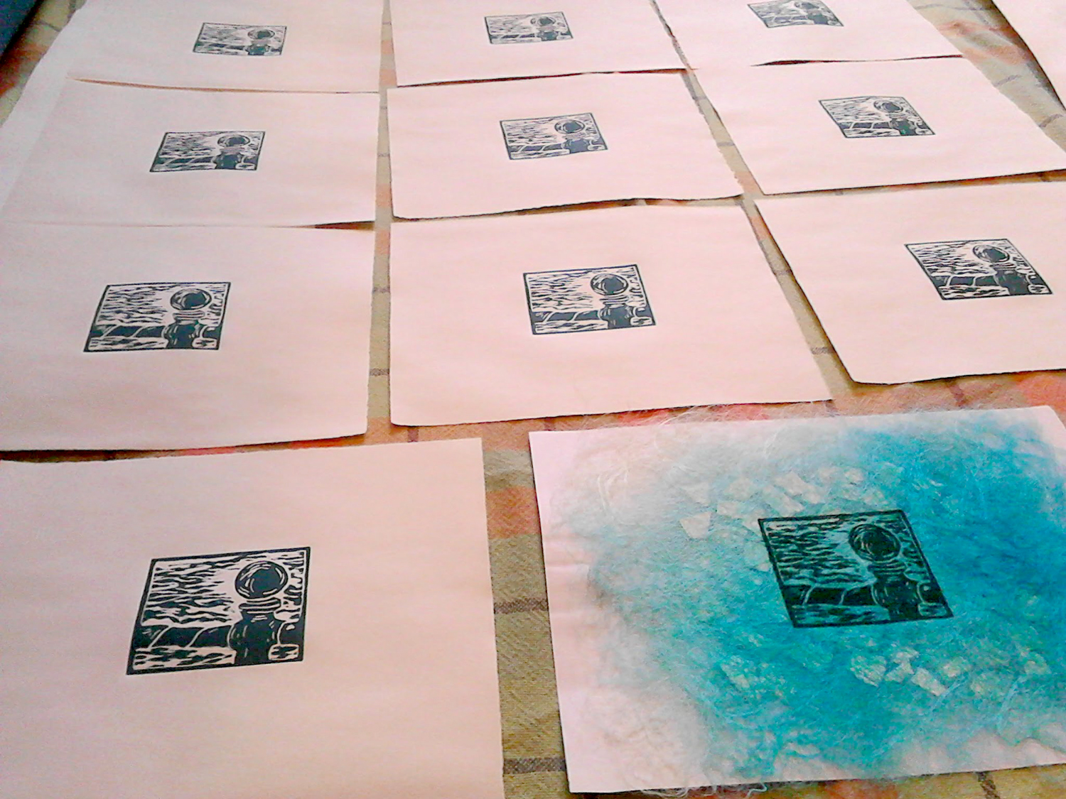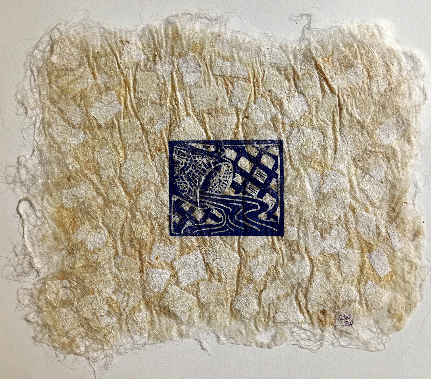 - Spilt Tea, 2020, linoprint on handmade silk fibre sheet, image size: 6.2 cm x 7.5 cm, sheet size: approx 21 cm x 26 cm